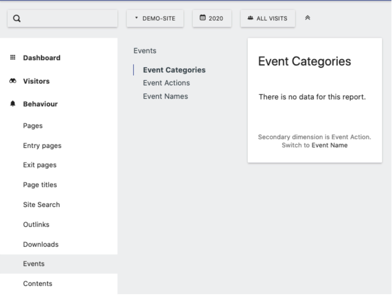 When first visiting the Events section, it’s common to see no data. Unlike page views, event tracking must be implemented manually, as the types of events and triggers will differ across websites.