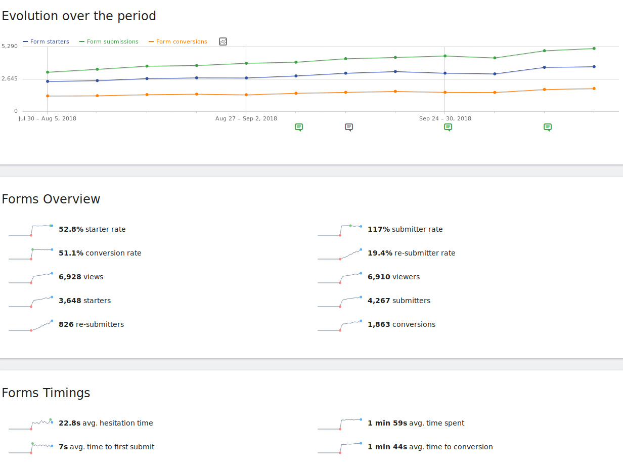 The Overview report shows all your form metrics over time. See at a glance whether more people are starting, submitting, and converting forms. Identify changes in metrics like time spent or field-specific issues.