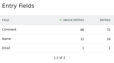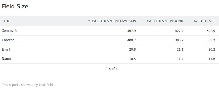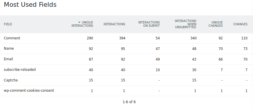 Entry Fields: The entry fields report shows you with which fields your users interact with first when they start filling out a form. If many users do not start with the first form field in your form field, you may want to consider reorganizing the order of your form fields. This can lower the time your visitors need to fill out your form and increase the form starter rate which should be always one of your objectives. The more people start filling out your form, the more will complete it. Imagine the first field in a form is a field your visitors want to skip or find ambiguous, then they might not even consider to start filling out your form at all.