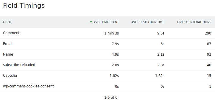 **Field Timings: **Time is truly critical when it comes to filling out a form. In this report you find out which fields your visitors spend a lot of time on, and where they hesitate the most. The longer they need to fill out a field or the longer they hesitate, the more likely it is that they will abandon your form.