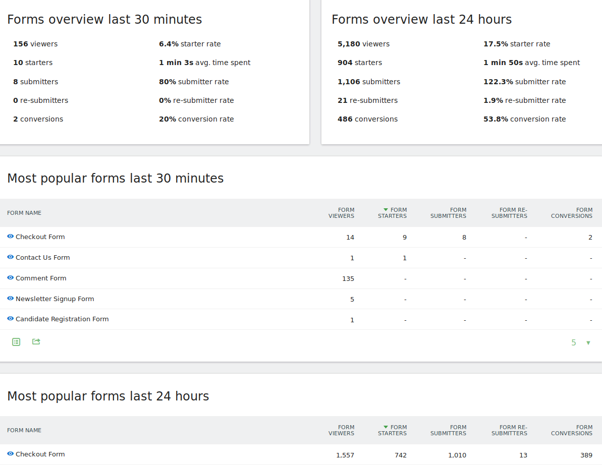 Form Summary: Displays form information, visitor logs, and all fields. Includes evolution graphs and sparklines for metrics like conversion rate, starters, and viewers to help identify areas for improvement.