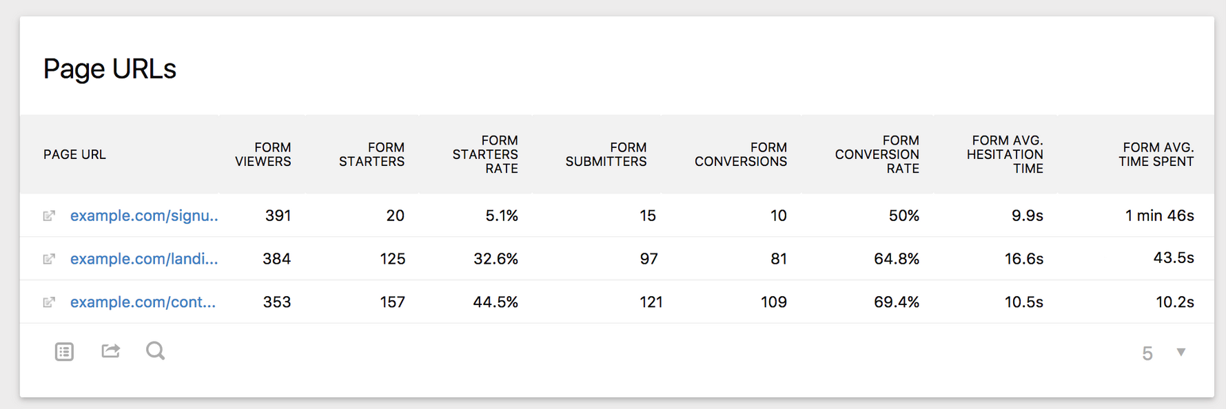 Page URL Report: Shows form performance per page, useful for A/B tests or evaluating the same form across different pages. The surrounding page context can significantly impact form interactions.