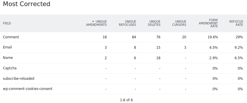 **Most Corrected Fields: **Discover where your visitors have the most problems filling out your form and causes frustration. Maybe different form fields are more suitable? Maybe you can pre-fill some values? Maybe the validation is too strict? Improving correction rates will directly lead to higher conversion rates.The report shows about 20 metrics about amendments, re-focuses, deletes (backspace), and cursor movements, and much more. As usual, when you hover a metric, you will get a tooltip that explains what the metric means and how the data is collected. Lowering the corrections will directly result in higher conversion rates.