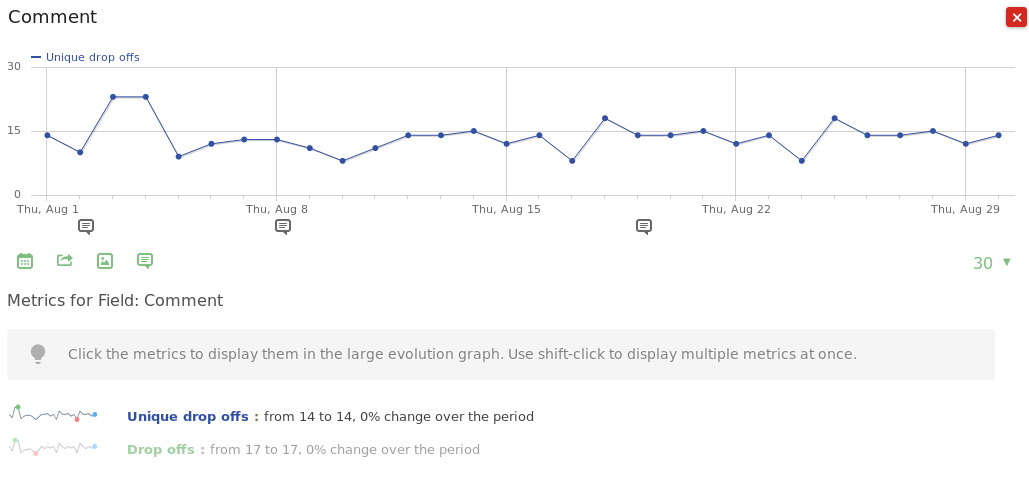 Row Evolution: For any row within a table you can select the “Row evolution” icon to see how each row performs over time. This gives you ultimate insights into all your metrics as you can see at a glance whether your changes actually make things better or worse. Are you for example interested whether the drop offs for the form field “Firstname” improves or gets worse? Simple click on the row evolution icon and find your answer. This works with any report. You can for example find out if the time spent on a certain field actually improves over time, and much more.