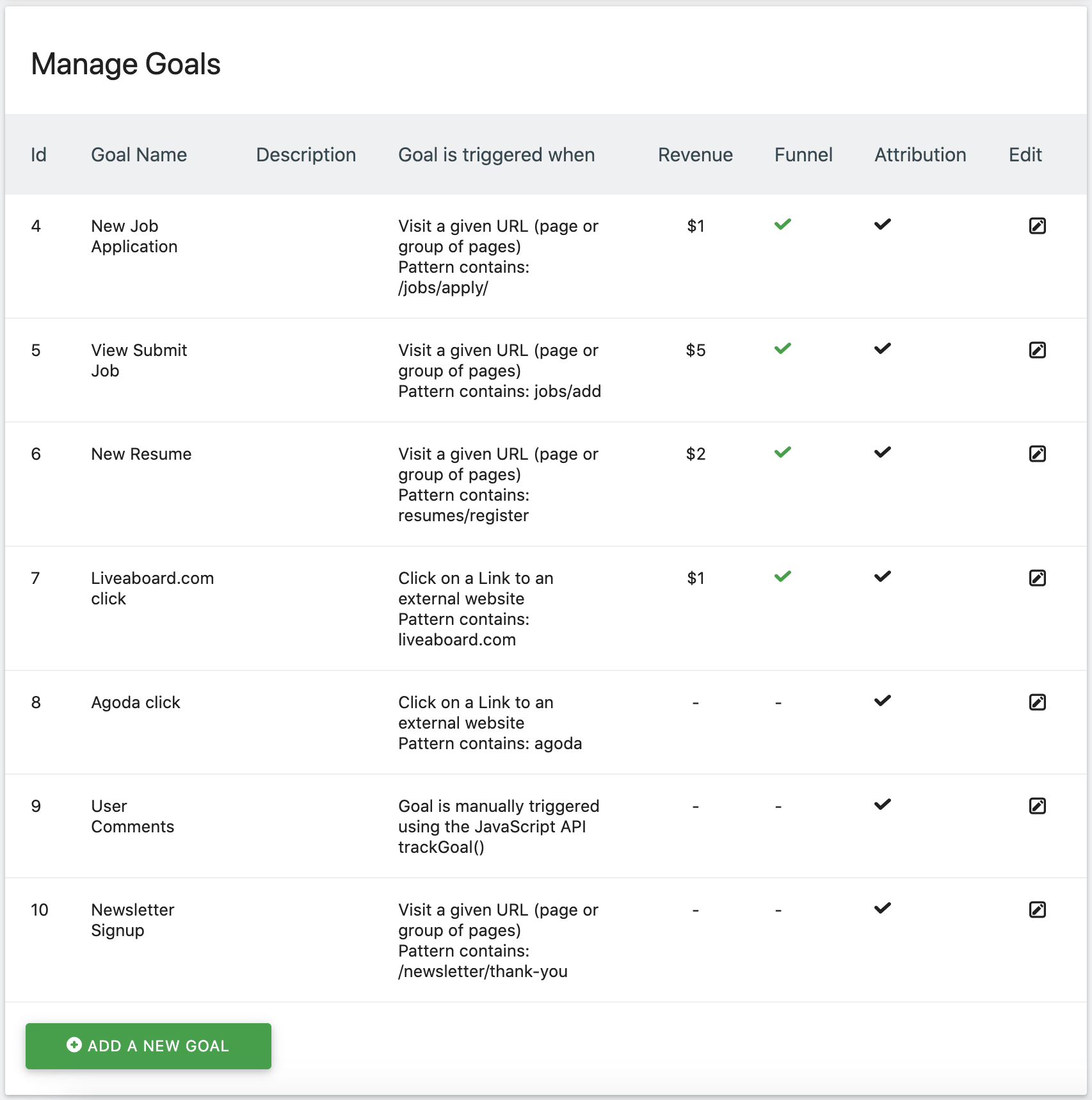 To edit any of your goals, simply click on the square pencil icon in the Edit column. You’ll be presented with a screen similar to the one used to create goals. Make any required edits by following the Goal creation steps outlined above, and then click the Update Goal button to confirm your changes.