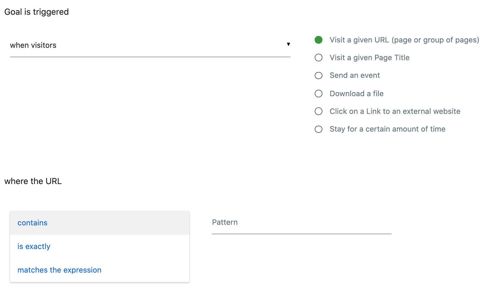 - Contains – Triggers when the URL contains the text entered, e.g., typing contact would fire the goal on pages like /contact.html or /support/contact/.