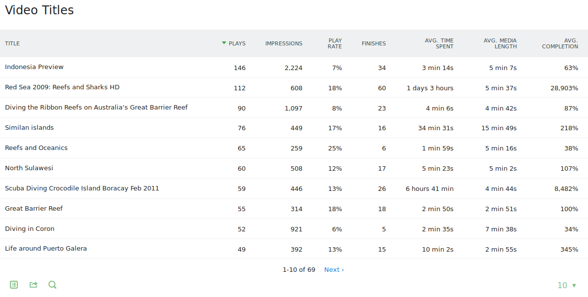 The Video & Audio reports provide key metrics on how and when your media was consumed. By clicking on the plus icon when hovering over a media item, you can drill down for even more detailed insights into individual media interactions.