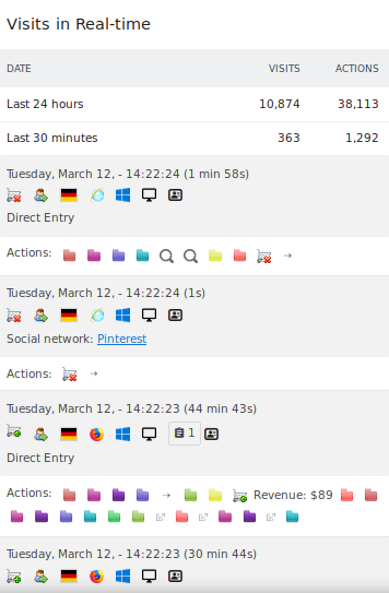 The Visits in Real-time report also displays a list of page views and actions performed by the visitor. Hovering over an icon shows the page name and the time it was accessed, while clicking the icon opens the actual page on your site.
