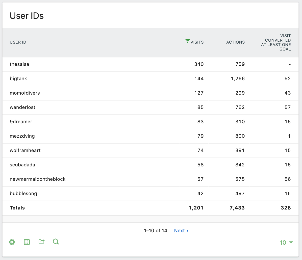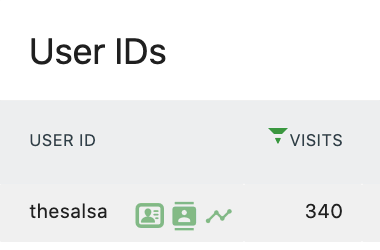 These statistics are helpful for analysing user groups, but you can also get more granular data for individual users. Hover over any User ID row, and you’ll see three green icons appear. Clicking these will let you dig deeper into that user’s visits.