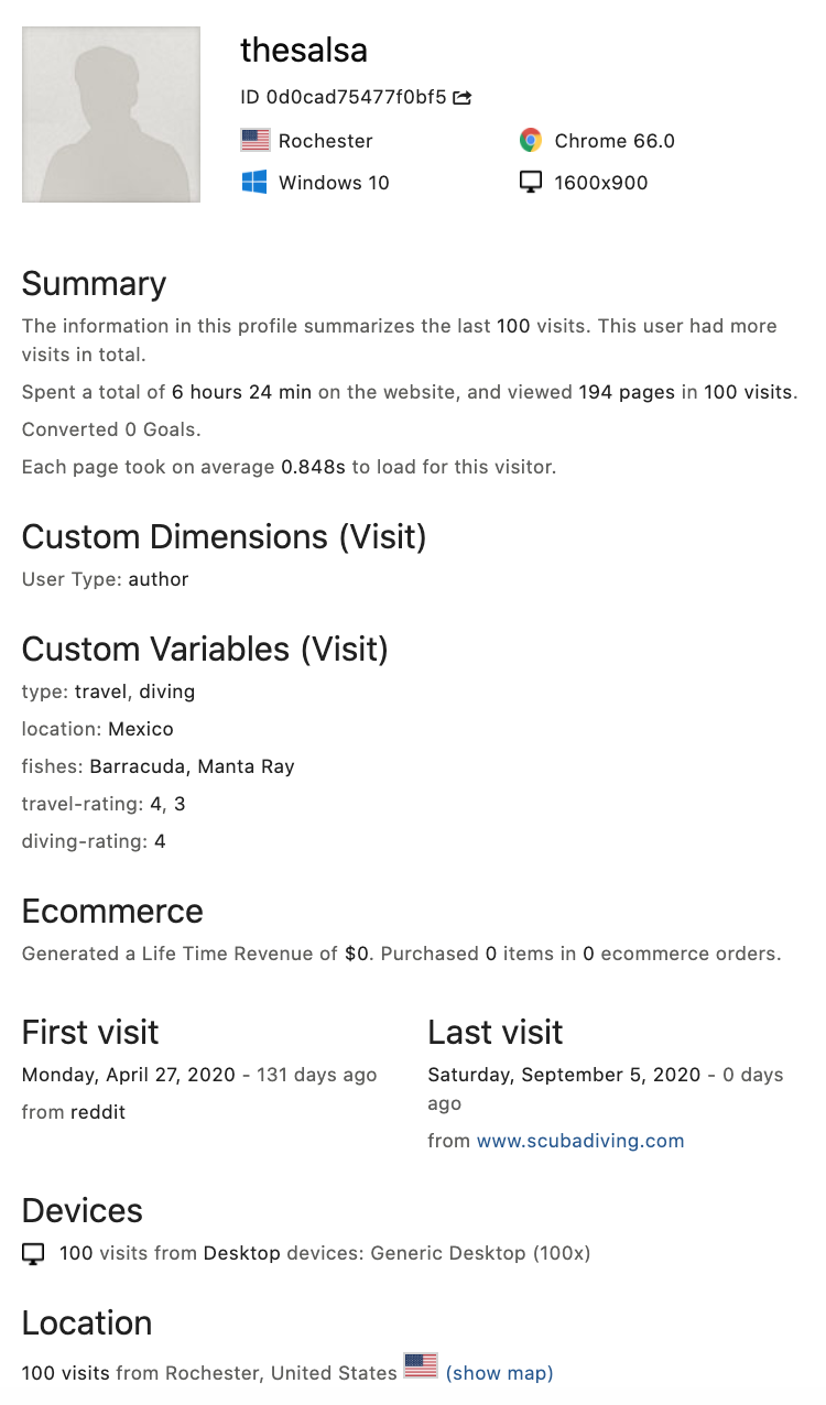 Click the user profile icon to load a Visitor Profile, which provides extended details such as location, device/browser usage, number of visits, custom dimensions, Ecommerce value, and a full breakdown of site interactions. This helps build detailed customer profiles and identify areas where you can deliver more value.