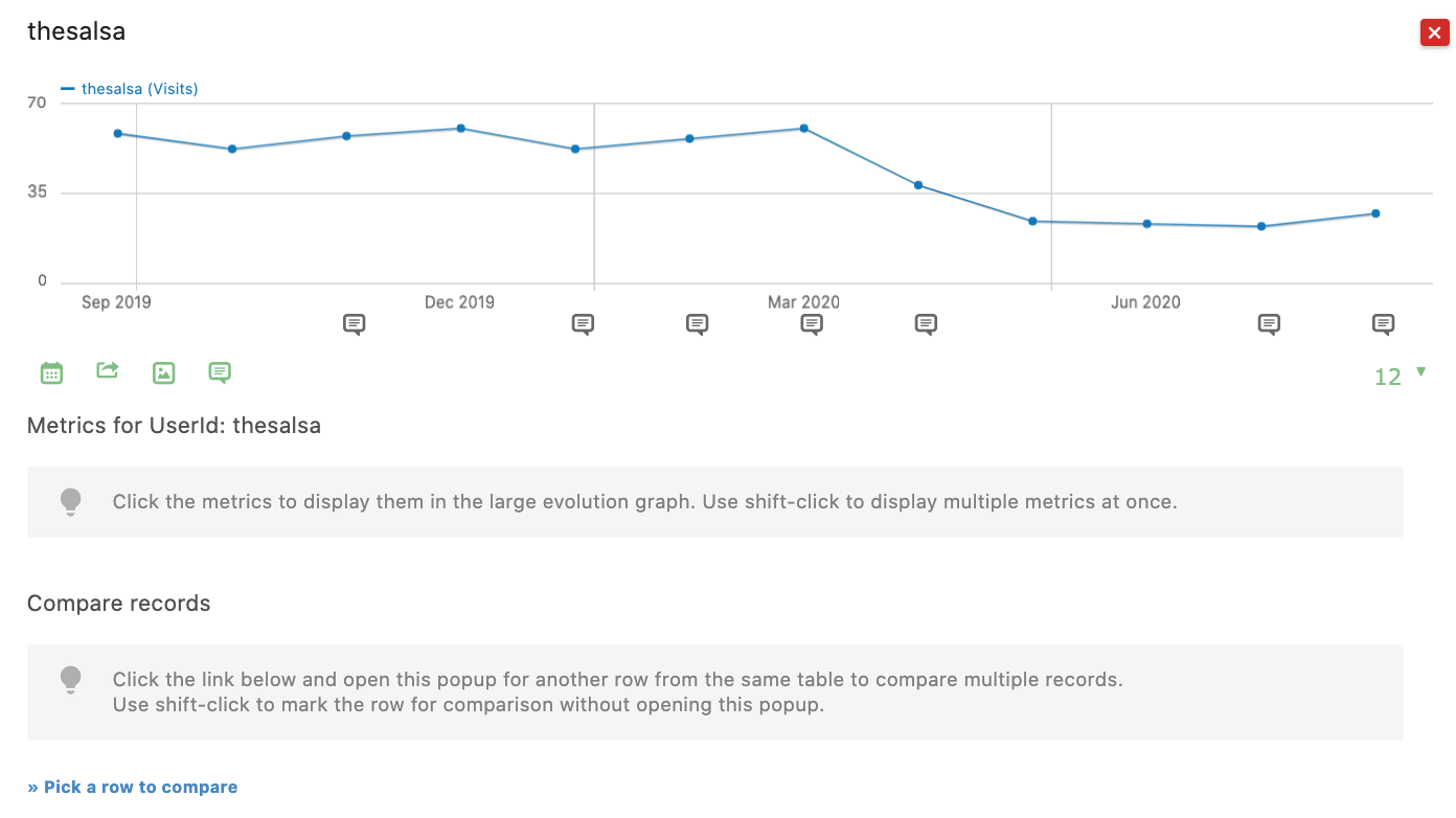 Click the row evolution icon to load an Evolution Graph, where you can track engagement trends for that user over time. This view helps identify patterns and potential issues — for example, dips in engagement that align with recent website changes.