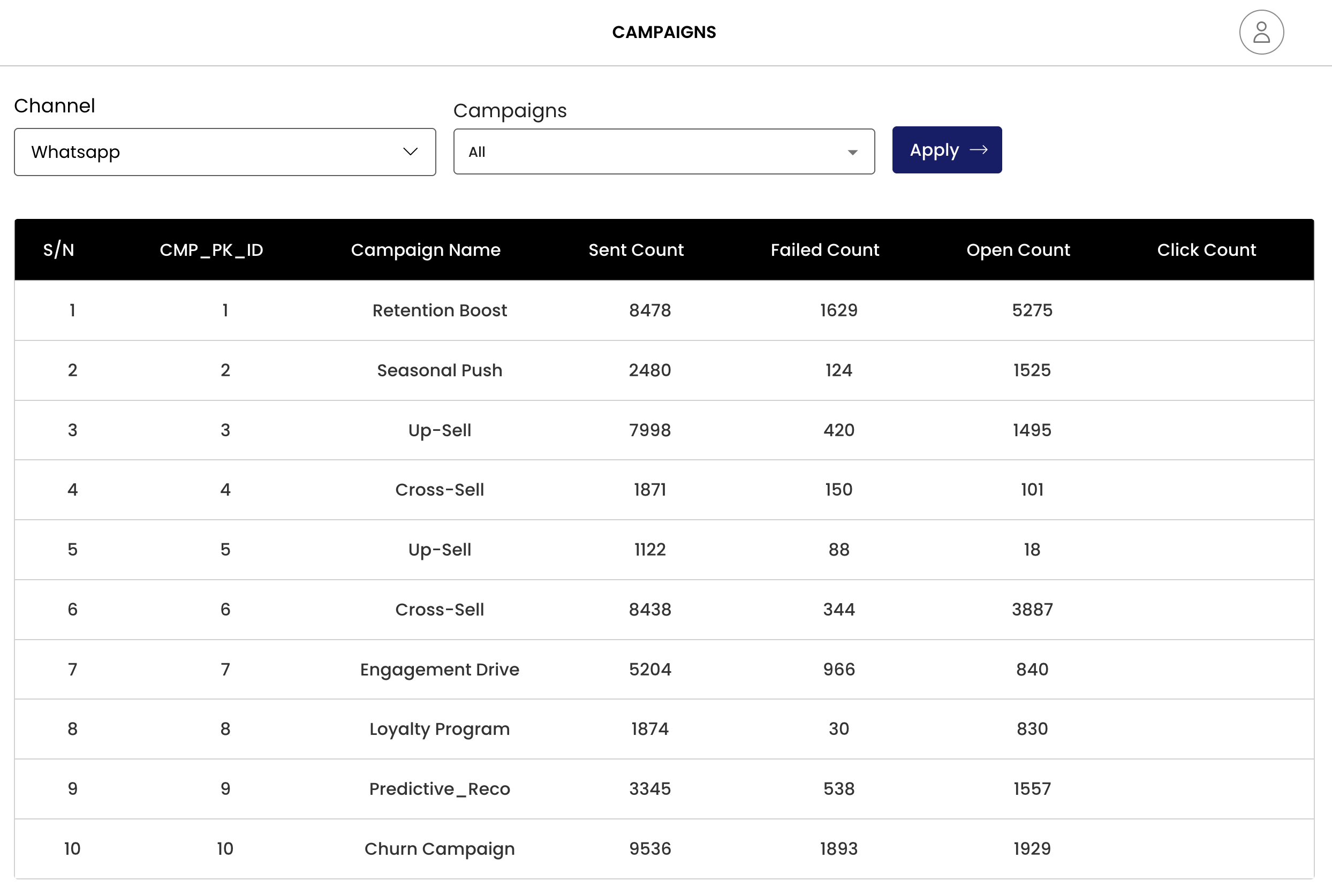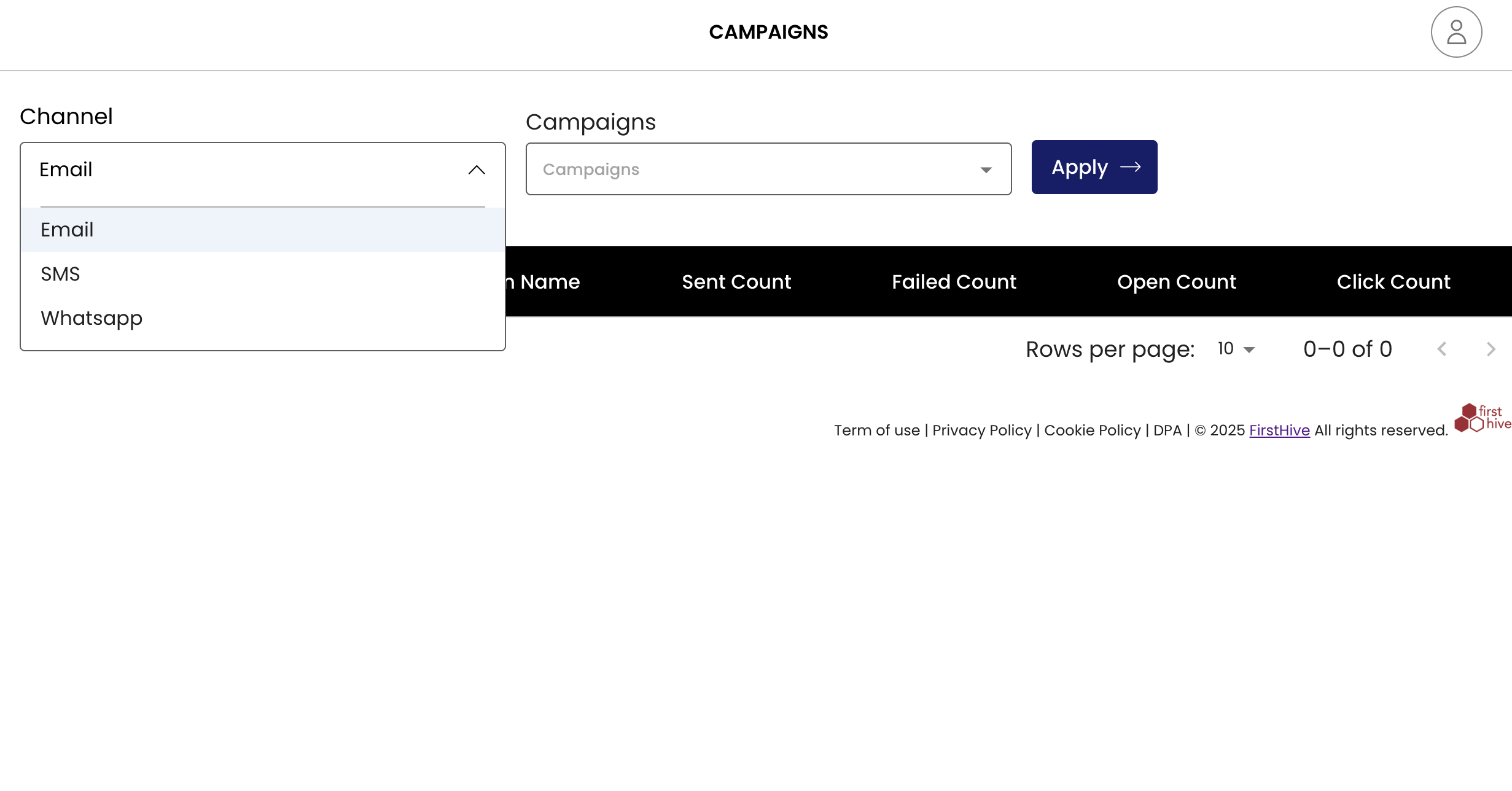 The Campaigns Dashboard in FirstHive CDP provides a comprehensive view of marketing campaign performance across multiple communication channels (Email, SMS, WhatsApp). This unified interface allows marketers to analyze campaign effectiveness through key engagement metrics.