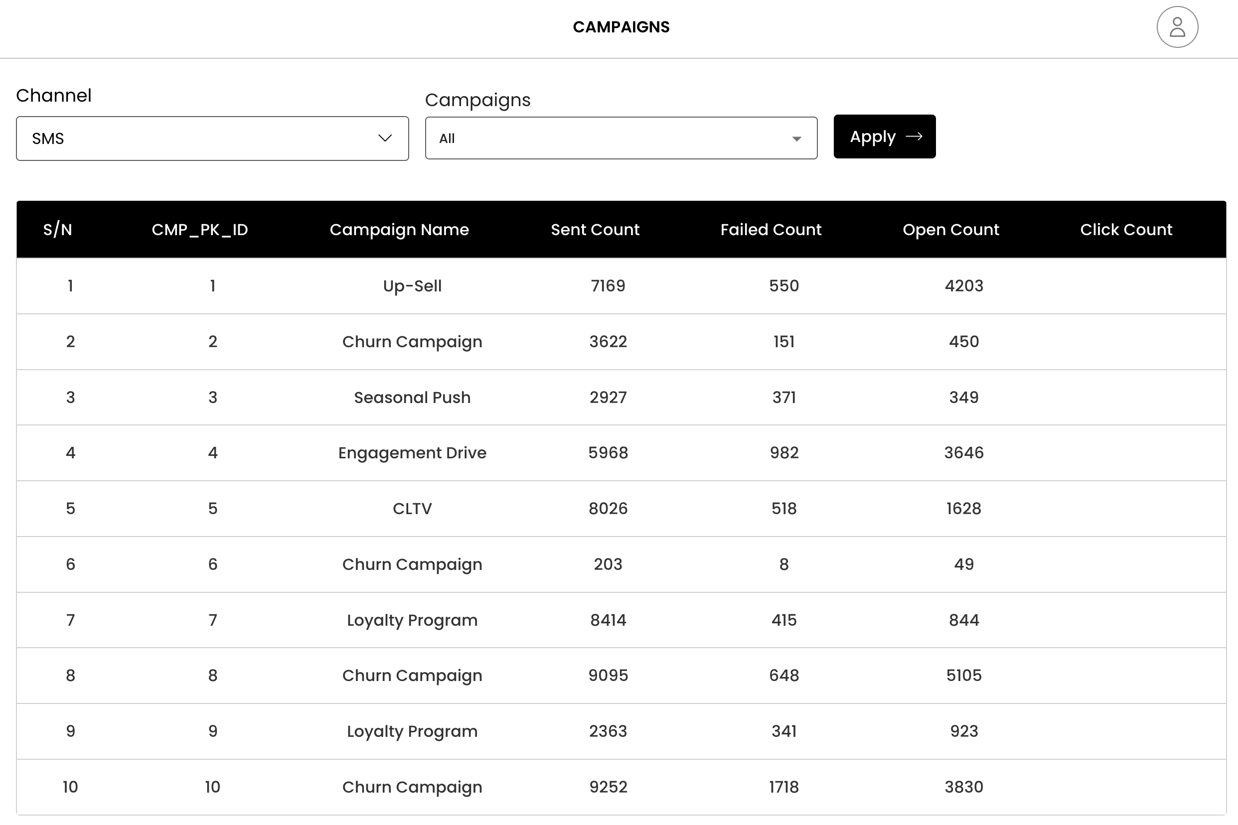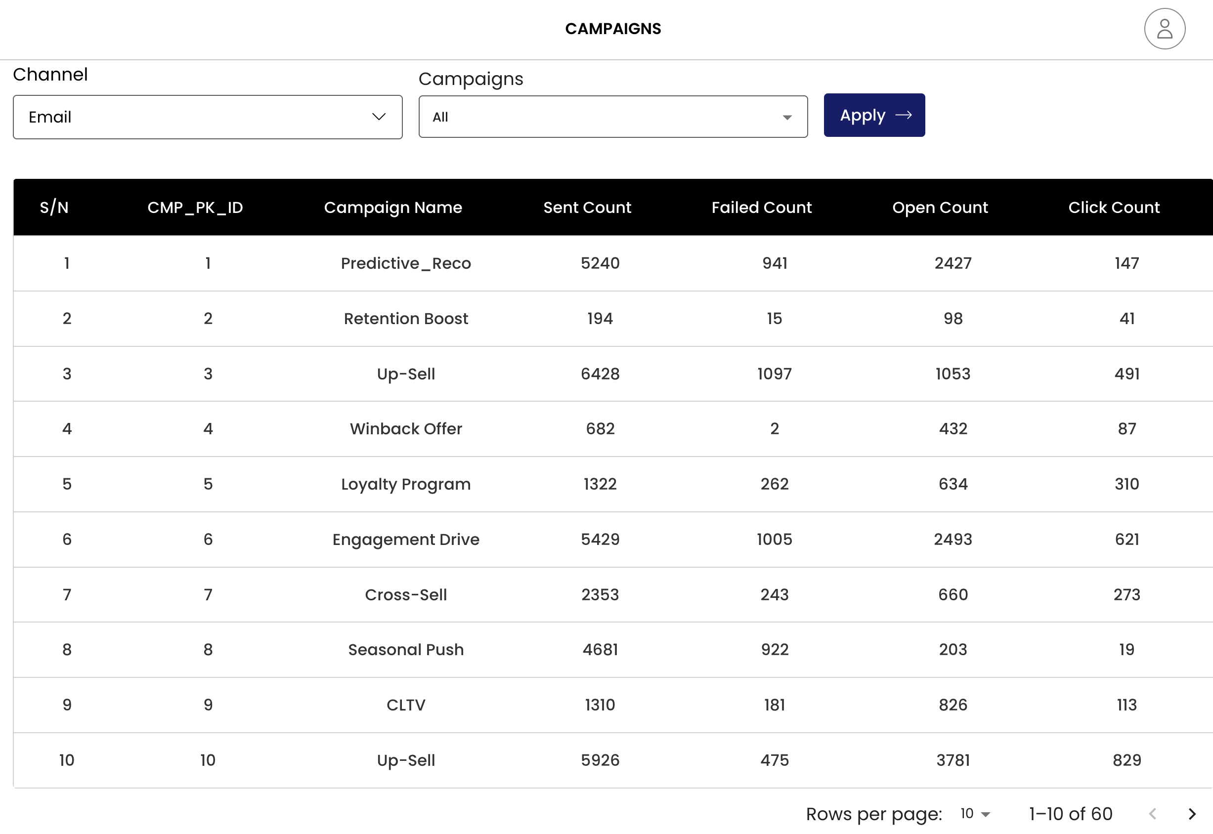 - Channel Comparison: Use channel filters to compare campaign performance across different communication methods