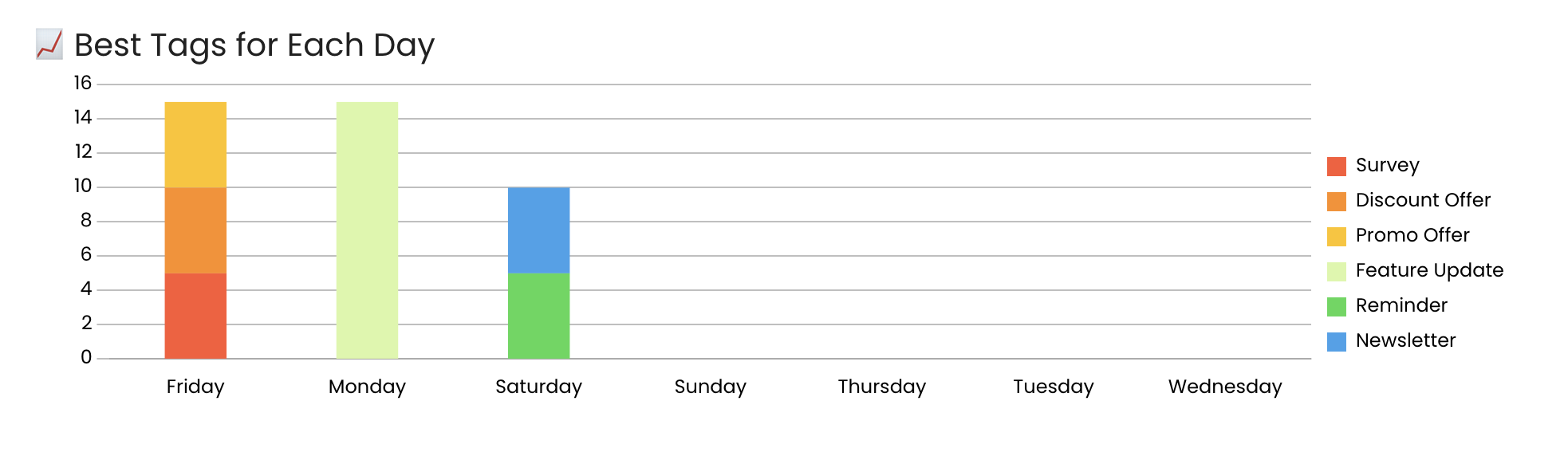 - Stacked Bar Chart: Shows tag performance distribution by day