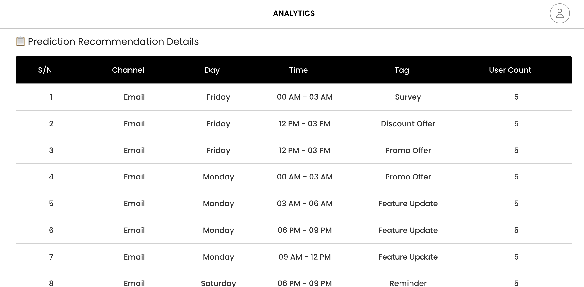 - Consistent User Count: Uniform audience size (5 users) across recommendations suggests segmented targeting